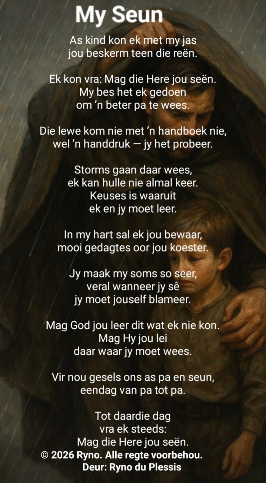 Inkdief ○ 2026 Ryno. Alle regte voorbehou. ” Op jou perd galop jy deur my hart se woorde. Jy beleef die gevoel en liefde.Elke letter skree jou naam, want jou siel praat saam. Uit my kluis van woorde raap jy alles wat jy wou hê. Plunder my naam asof dit nog nooit bestaan het nie. […]