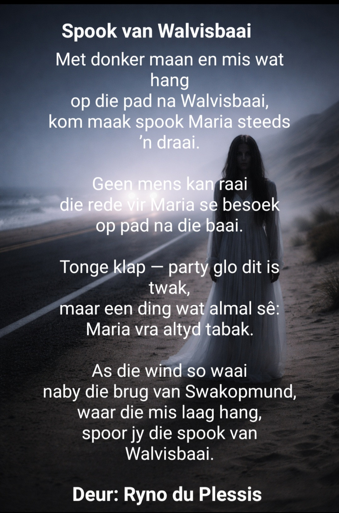 Met donker maan en mis wat hang op die pad na Walvisbaai, kom maak spook Maria steeds ‘n draai.