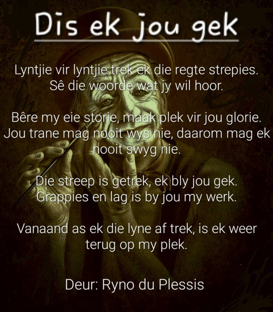 Die streep is getrek, ek bly jou gek. Grappies en lag is by jou my werk.