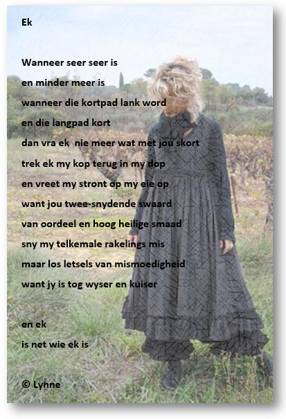 Hi Lynne, wat vir my interessant is van die gedig, is dat ek voel asof ek myself aan altwee kante sien, m.a.w ek voel so maklik gekwets deur ander se vrye kommentaar en die boksie waarin die samelewing se reels mens wil sit en aan die ander kant, kan ek net so maklik daar vlymskerp kommentaar uitdeel en nie altyd besef hoe ek mense verwond het nie. Ek, is ook maar net ...ek.