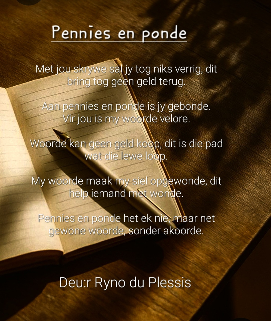 Aan pennies en ponde is jy gebonde Vir jou is my woorde velore.