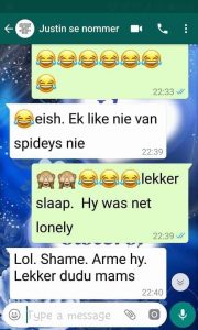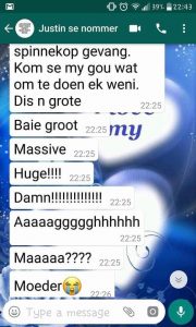 Dut net in gistraand toe my foon bitterlik aan’t bewe gaan. Ek sit my foon altyd op vibreer deur die nag. Maar kyk, daai foon klink of hy kouekoors het. Ruk my aan my hare uit ‘n lekker diep droom uit. Dog eers dis ‘n nagmerrie, want die perd se hoewe klop nog aanhoudend aan my deur. Ek katapult op net toe die deur stadig oop kraak…. Man ek dog ek vlieg die laaste meter na die kamerdeur toe. So deur die “highfly” gryp ek Charles se oorgroot Japon raak en heel deur die weer loop ek tromp op in Justin se paniekerige stem vas. MA! Spinnekop help! Toe weet ek hier kom ‘n ding.. Kyk Doom hou ek net vir vlieë, want hulle verpes ek soos rou ui op ‘n tamatiebroodjie. Nou is ek wakker! Ek is mal oor spinnekoppe. Daai lyfies met die agt pote wat teen ligspoed beweeg, fassineer my oneindig. Justin NIE… dink sy ma is mal. Daar sit ta se kind. Teen die messelaai. Stille bewys dat sommige groeiende kinders in die middel van die nag tog weer honger word. Nou kyk daai spinnekop is groot. Selfs brawe ek kry hoendervleis toe ek sy mooiheid aanskou. Vergeet ek, ek het Charles se oorgroot japon aan. Gryp’ n koerant en probeer die mannetjie uitlok om op te klim. Spring daai lyfie mos soos ‘n wafferse atleet bo-oor my uitgestrekte hulp aanbod, bo-op my lekker los japon en weer af op die kas. Justin word ‘n hoogspring kampioen en beland bo-op die kombuis blad. Spinnekop skrik hom lam en rol in n balletjie. Ai “sjame”. Uiteinde van die storie… Spinnekop veilig buite en ons kon gaan slaap. PS. O ja die skermskoot wat volg was die rede vir die groot vibrasie wat my wakker laat skrik het.