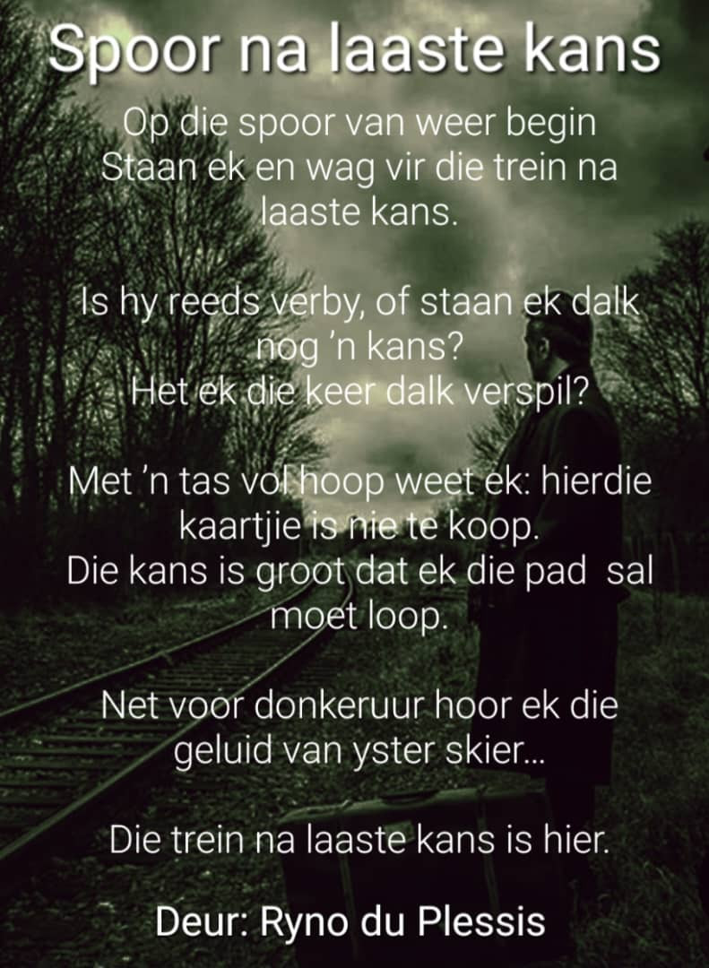 Op die spoor van weer begin, staan ek en wag vir die trein na laaste kans.